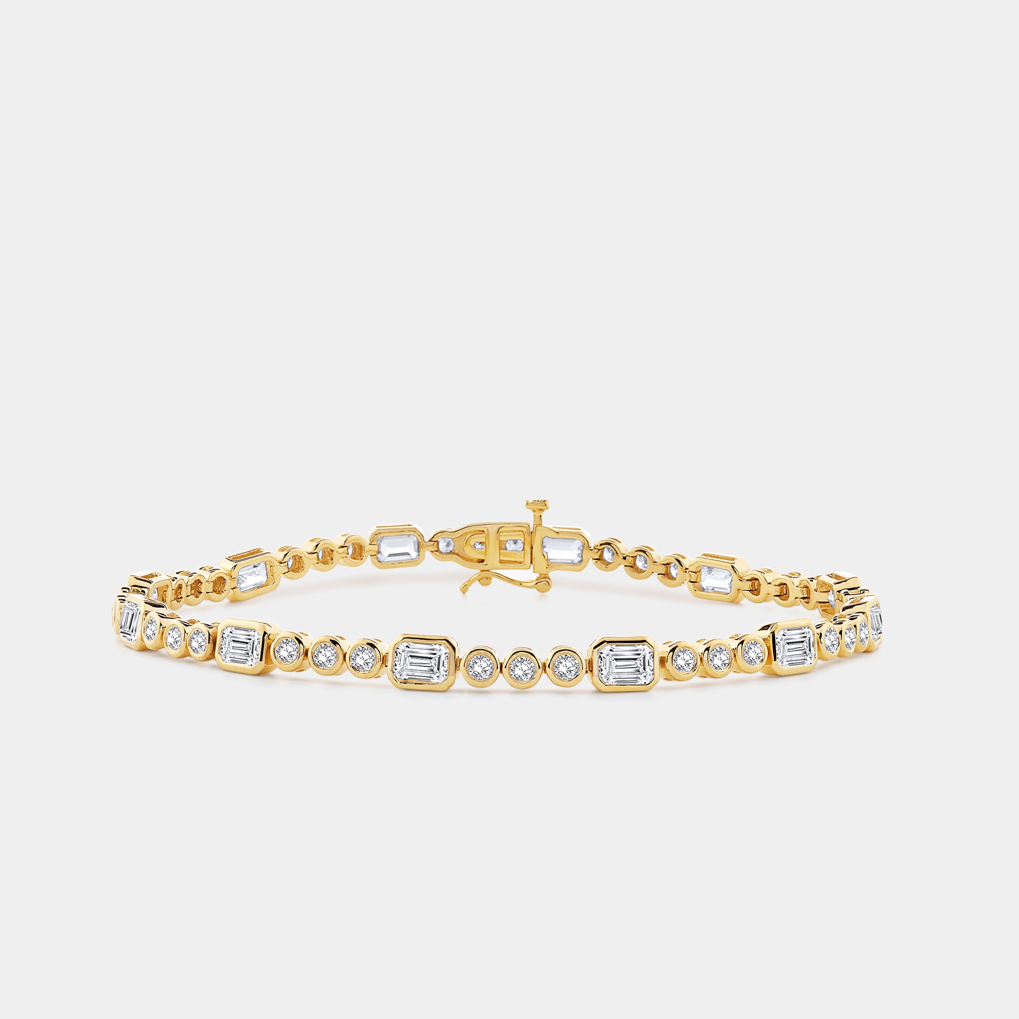 Nothing says eternal classic like our Gilded 5 Carat Lab-Grown Diamond Round-Shaped and Emerald Cut, Bezel-Set Tennis Bracelet. A row of emerald and round diamonds bring the glitter and sparkle to your wrist, while the 4-prong setting adds texture and depth. Wear it as a timeless statement by itself or stack it with others for added glamour. This bracelet is the final element of sophistication for your wrist that will never go out of style.