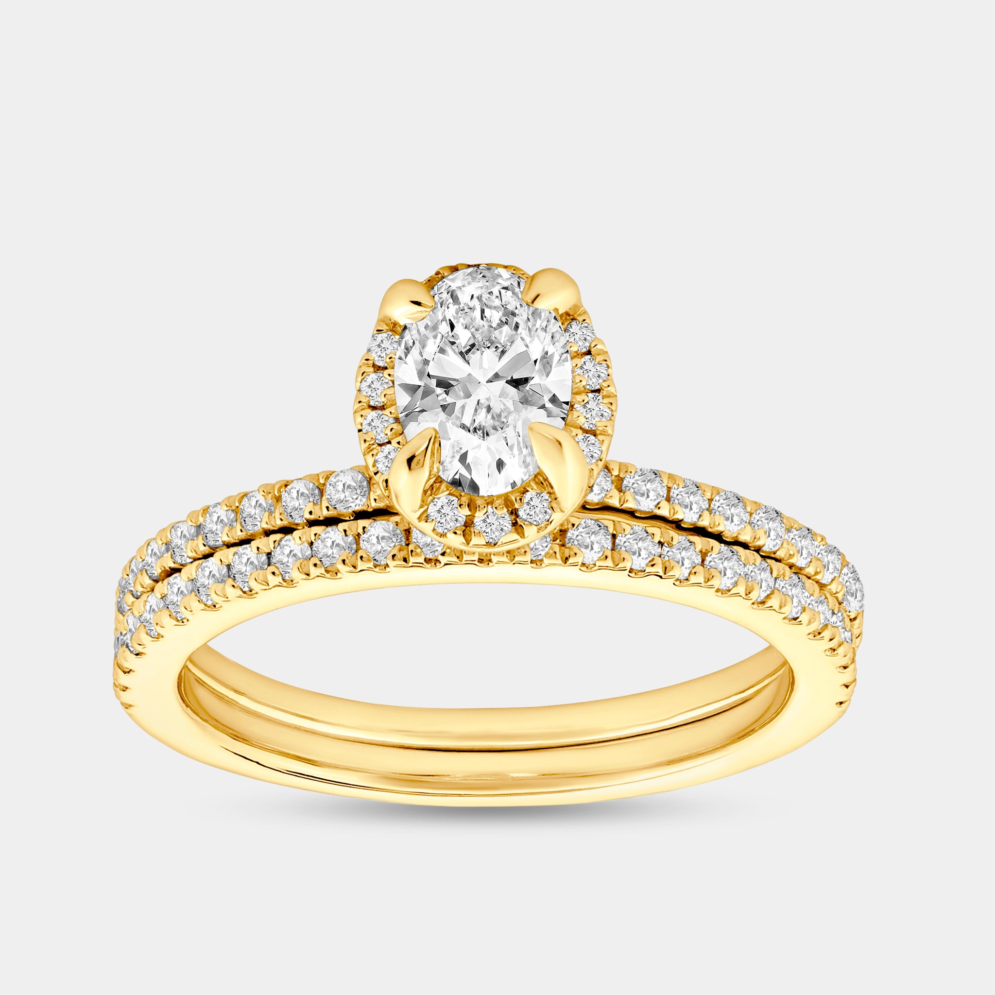 Tell the story of your love with the Gilded 1 Carat Lab-Grown Oval-Shaped Hidden Halo Engagement Ring Set, a feat of remarkable sophistication and beauty. A delicate glimmering hidden halo of diamonds hugs an exquisite larger oval-shaped diamond at the center, making it the perfect heirloom to immortalize your love story.